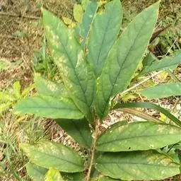 叶密集地排于小枝顶部,叶片近革质,椭圆形、椭圆状披针形或倒披针形,长4-10厘米,宽1.5-3厘米,先端渐尖至尾状渐尖,基部渐狭至楔形,全缘,波状,叶面绿色,背面淡绿色,两面无毛,主脉上面凹陷,背面隆起,侧脉8-9对,上面明显,背面略突起,于边缘附近网结,网脉不见;叶柄长6-10毫米,上面具槽。