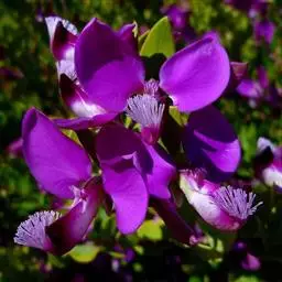 总状花序2-5个成簇生于小枝近顶端的数个叶腋内,长3-7厘米,被白色腺毛状短细毛;花长12-20毫米,疏松地排列于花序上,花梗长约6毫米,基部具小苞片3枚,中央苞片三角状渐尖,侧生者卵形,先端钝,早落;萼片5,早落,外面3枚卵形,长2-3毫米,宽1.5-2毫米,先端钝,具缘毛,内萼片花瓣状,斜倒卵形,长约13毫米,先端圆形,内凹,基部渐狭,具缘毛或无;花瓣3,黄色,稀白色或紫红色,侧生花瓣略短于龙骨瓣,3/4以下与龙骨瓣合生,先端截形,龙骨瓣长15毫米,具2兜状、先端圆形或2浅裂的鸡冠状附属物;雄蕊8,花丝长约15毫米,3/4以下连合成鞘,并与花瓣贴生,花药长卵形,顶孔开裂;子房倒卵形,长1.5-2毫米,径约1.5毫米,基部具1一侧开放的高脚花盘,花柱长约12毫米,顶部增厚并弯曲,先端2浅裂,柱头生于下裂片内。