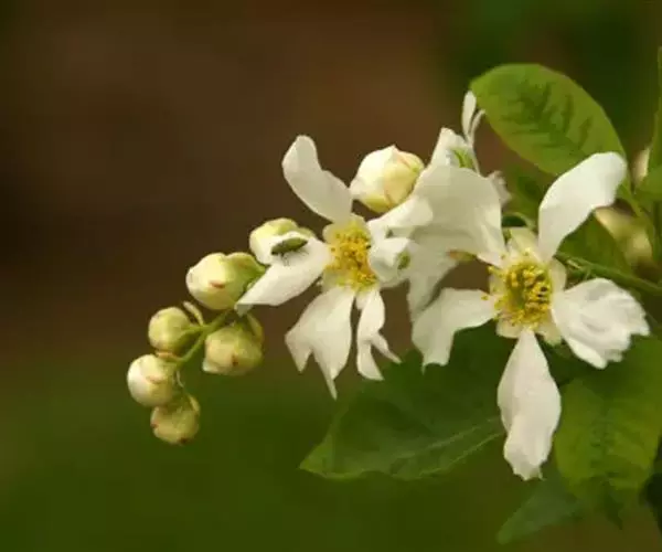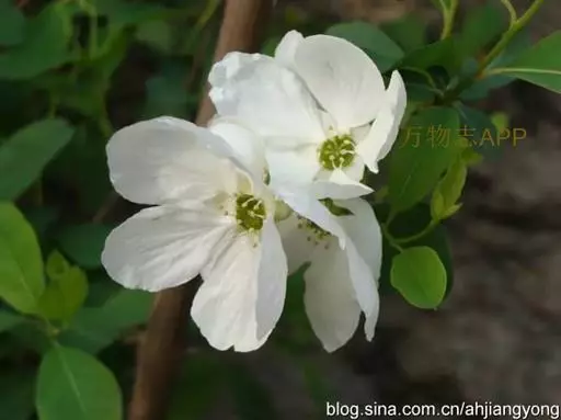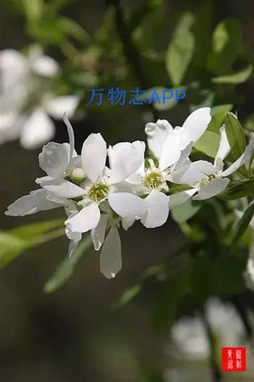 枝条细弱开展;小枝圆柱形,微有稜角,无毛;冬芽三角卵形,平滑无毛,暗紫红色。叶片椭圆形,长椭圆形至长圆倒卵形,先端圆钝或急尖稀有突尖,基部楔形或宽楔形,上下两面均无毛;叶柄短或近于无柄;总状花序无毛;花梗基部较顶部稍长,无毛;苞片小,宽披针形;花直径2.5-3.5厘米;萼筒浅钟状,无毛;花瓣倒卵形,先端钝,基部有短爪,白色;雄蕊15-20,3-4枚一束着生在花盘边缘;蒴果,倒圆锥形,无毛,有5脊,果梗长3-8毫米。花期5月,果期6-8月。