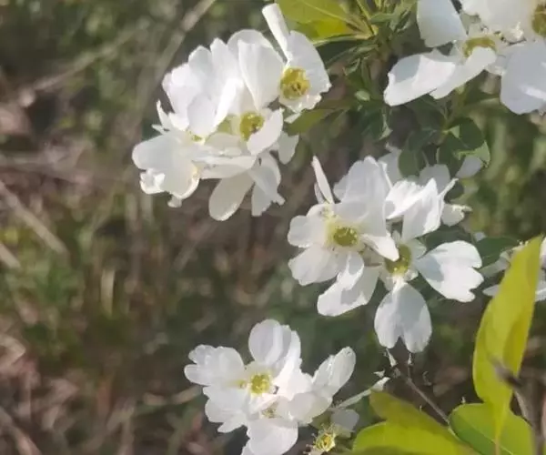 顶生总状花序,有花6-10朵,无毛;苞片小,宽披针形;花直径2.5-3.5厘米;萼筒浅钟状,无毛;萼片宽三角形,长约2毫米,先端急尖或钝,边缘有尖锐细锯齿,无毛,黄绿色;花瓣5,倒卵形,长约1.5厘米,宽约1厘米,先端钝,基部有短爪,白色;雄蕊15-20,3-4枚一束着生在花盘边缘,与花瓣对生;心皮5,花柱分离。
