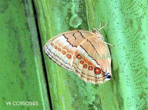 箭环蝶属于昆虫纲鳞翅目 环蝶科箭环蝶属的一类昆虫 ,主要分布于中国南方地 区 箭环蝶Stichophthalma louisa,环蝶科箭环蝶属的一种蝴蝶。箭环蝶褐黄色,体大型,前翅正面黄褐色,前后翅周边有一圈箭簇状黑斑,也象矛头,又似小鱼图案,故名。翅的腹面中域有一纵列红褐色圆形斑(眼斑)中心米色,圆斑围为深褐色边缘,圆斑内侧有二暗褐色线纹,钩勒出近似人形的侧影图。