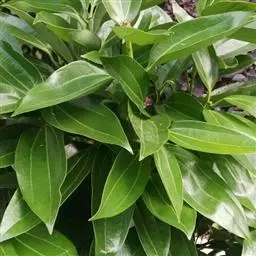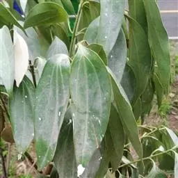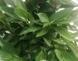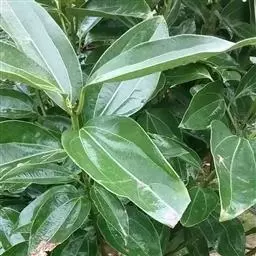 2、阴香。常绿乔木,高达20m。小枝赤褐色,无毛。叶近于对生或散生,革质,卵形或长椭圆形,长6-10cm,宽2-4cm,先端短渐尖,基部楔形至近圆形,全缘;上面绿色,有光泽,下面粉绿色,两面均无毛,具离基3出脉,脉腋内无隆起的腺体;叶柄长8-12mm。圆锥花序顶生或腋生;花小,绿白色,花被6,基部略合生,长4-5mm,两面均被柔毛;能育雄蕊9,排成3轮,外面2轮花药内向,第3轮花药外向,花药均为卵形,4室,瓣裂,花丝短,最内尚有1轮退化雄蕊;雌蕊1,子房上位,1室,1胚珠,花柱细,柱头小。浆果核果状,卵形,长不及1cm,直径约5mm,基部具肥厚杯状的宿存花被,其先端具6截形短裂片。花期3-4月。果期4-10月。