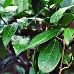 3、细叶香桂,常绿高大乔木。树皮灰色,小枝密生绢状毛。叶在新枝对生,在老枝互生,革质,卵状椭圆形至披针形,长4-14cm,宽1-6cm,先端长渐尖,基部楔形,全缘,上面绿色,有光泽,下面密生绢状短柔毛,具离基3出脉,在背面显着隆起。圆锥花序腋生;总花梗和花梗密生白色短柔毛;花淡黄色,花被6裂,基部筒状;雄蕊、雌蕊与前种相似。浆果椭圆形,基部具宿存萼筒,全缘。花期5-6月。果期6-12月。