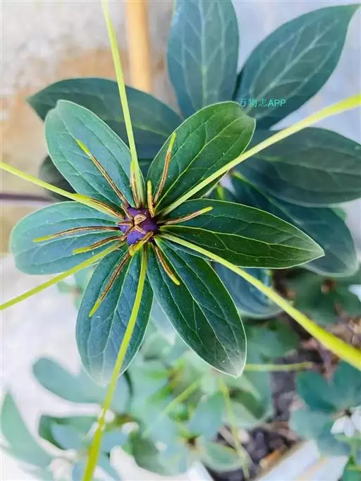 七叶一枝花 七叶一枝花植株高35-100cm,无毛;根状茎粗厚,直径达1-2.5cm,外面棕褐色,密生多数环节和许多须根。茎通常带紫红色,直径(0.8-)1-1.5cm,基部有灰白色干膜质的鞘1-3枚。叶(5-)7-10枚,矩圆形、椭圆形或倒卵状披针形,长7-15cm,宽2.5-5cm,先端短尖或渐尖,基部圆形或宽楔形;叶柄明显,长2-6cm,带紫红色。花梗长5-16(30)cm;外轮花被片绿色,(3-)4-6枚,狭卵状披针形,长(3-)4.5-7cm;内轮花被片狭条形,通常比外轮长;雄蕊8-12枚,花药短,长5-8mm,与花丝近等长或稍长,药隔突出部分长0.5-1(-2)mm;子房近球形,具稜,顶端具一盘状花柱基,花柱粗短,具(4-)5分枝。蒴果紫色,直径1.5-2.5cm,3-6瓣裂开。种子多数,具鲜红色多浆汁的外种皮。花期4-7月,果期8-11月。