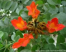 常有上痂状凸起。叶对生,奇数羽状复叶;总叶柄长3-6cm,小叶柄短;小叶多为7枚,卵形至阔椭圆形,长1-2.5cm,先端短尖或钝,基部阔楔形,边缘有不甚规则的锯齿,秃净或于背脉腋内有绵毛。总状花序顶生;萼钟状,5齿裂;喜温暖、湿润和充足的阳光。不耐寒,不耐阴。生长适温:4-10月为20-24度;10月至翌年4月为12-16度。冬季温度不可低于8度。萌发力强。对土壤选择不严,喜排水良好的砂壤土。切忌积水。在云南省西双版纳可全年开花,花橙红色至金黄色。北方盆栽温度适宜时,花期为8-11月;蒴果扁线形,多不结实,但也有十分结实的。