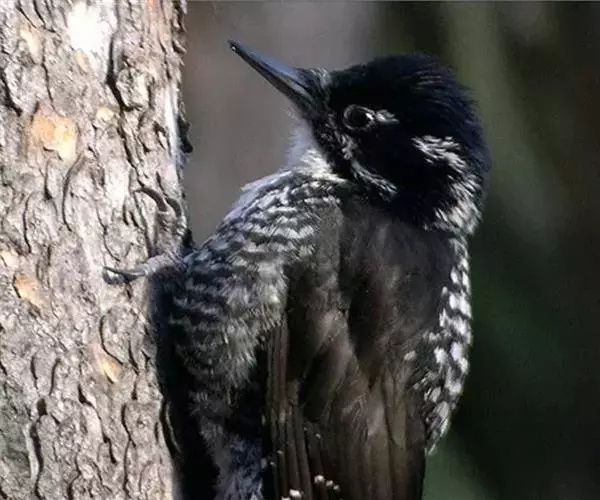 三趾啄木鸟雌鸟和雄鸟相似,但额和头顶黑色而具白色羽端;眉纹、后头、后颈和耳覆羽黑色而具蓝紫色光泽。眼后耳羽间杂以白色纵纹并延伸至头侧后方;背中央白色,胸和上腹污白色,胸侧和两胁污白色,密杂以黑色斑块。下腹和尾下覆羽白色而杂以黑褐色横纹。其余同雄鸟。