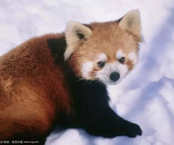 成体毛色:小熊猫成兽全身被有红褐色粗的长毛,但有的个体在臀背部有鲜亮的橙黄色毛尖,绒毛灰褐色,甚为丰厚。鼻端、眼圈为黑褐色,胡须为白色。嘴周围,鼻上部、两颊、眼眉上都有白斑。头部前额为棕黄色或淡黄棕色。耳壳外缘及耳内长有白毛,耳背黑褐色,耳基部外侧有一簇白色长毛。颈下及腹部为黑褐色,腹部毛短,色稍浅。四肢和足掌都为黑色,足底有黄色绒毛,盖住蹠垫。爪为乳白色。尾毛粗短而蓬松,上有红褐、黄白、或红褐、黑褐色相间的环纹。尾端为黑褐色。小熊猫的毛色无冬夏毛的差异。