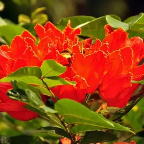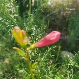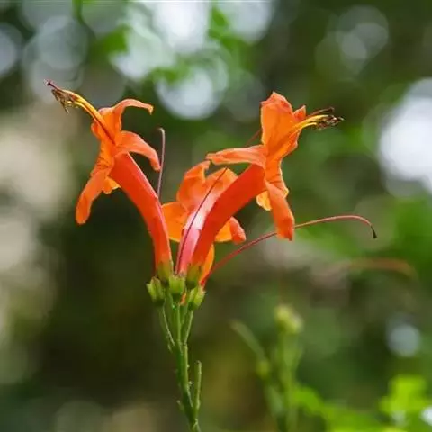 花冠内面鲜红色,外面橙黄色,长约5厘米,裂片半圆形。雄蕊着生于花冠筒近基部,花丝线形,细长,长2-2.5厘米,花药黄色,个字形着生。花柱线形,长约3厘米,柱头扁平,2裂。蒴果顶端钝。花期5-8月。