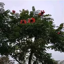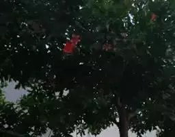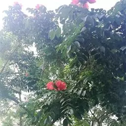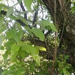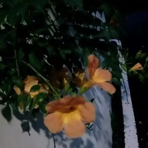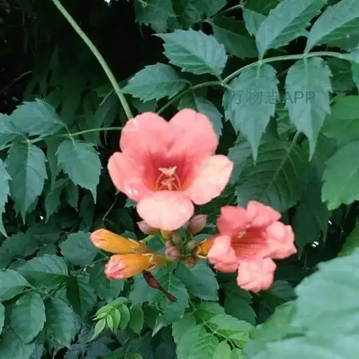 凌霄花 攀援藤本;茎木质,表皮脱落,枯褐色,以气生根攀附于它物之上。叶对生,为奇数羽状复叶;小叶7-9枚,卵形至卵状披针形,顶端尾状渐尖,基部阔楔形,两侧不等大,长3-6厘米,宽1.5-3 厘米,侧脉6-7对,两面无毛,边缘有粗锯齿;叶轴长4-13厘米;小叶柄长5(-10)毫米。