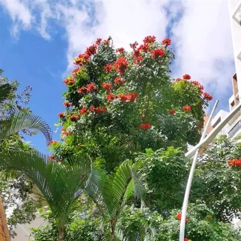 凌霄为著名的园林花卉之一。其花朵漏斗形,大红或金黄,色彩鲜艳。花开时枝梢仍然继续蔓延生长,且新梢次第开花,所以花期较长。