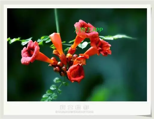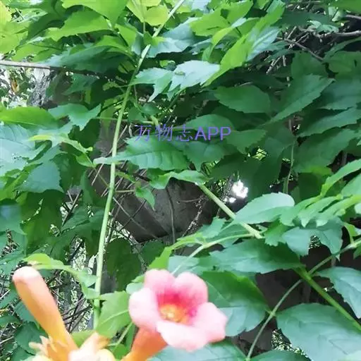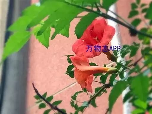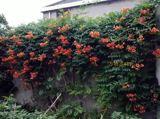 借气生根攀援它物向上生长,羽状复叶,小叶卵形,边缘有锯齿,花鲜红色,花冠漏斗形,结蒴果,喜欢排水良好土壤,较耐水湿、并有一定的耐盐碱能力。