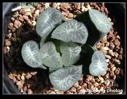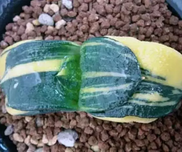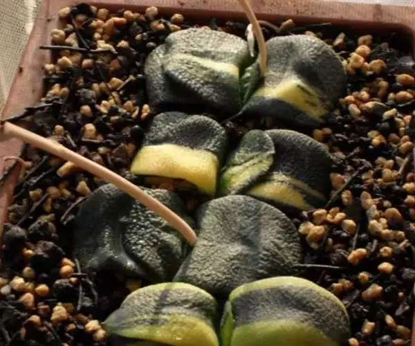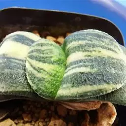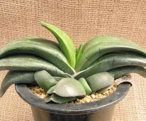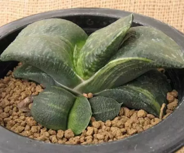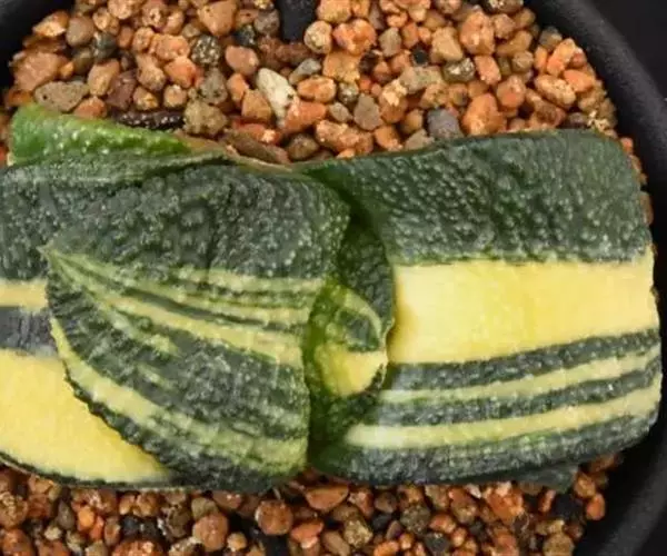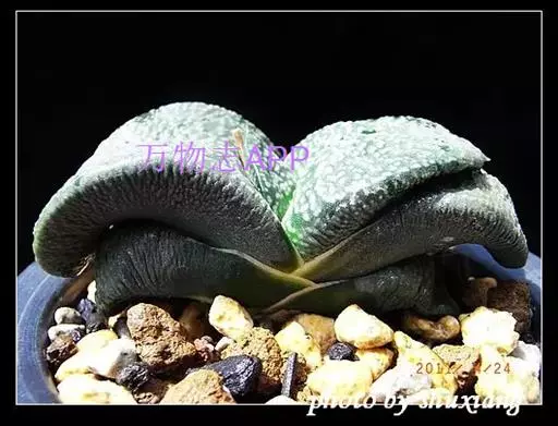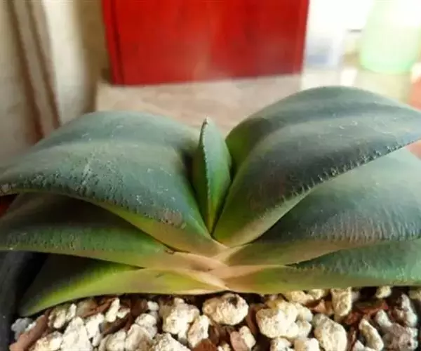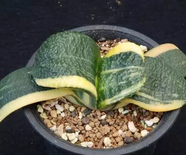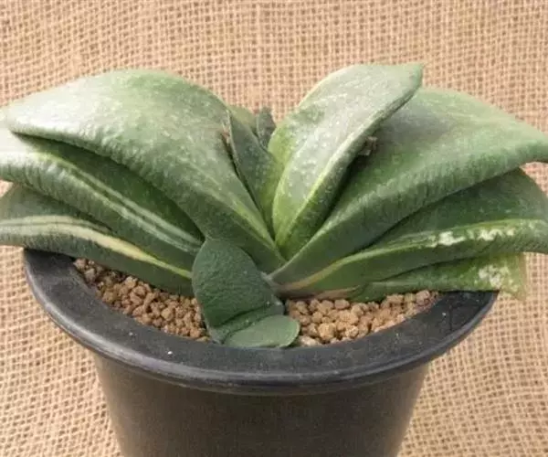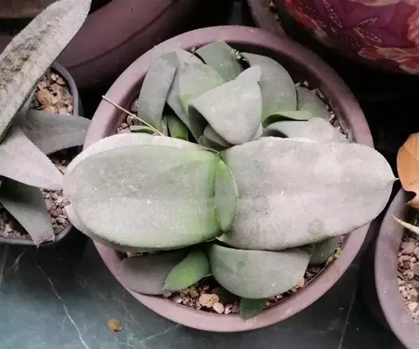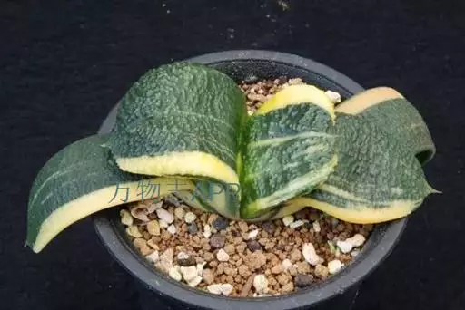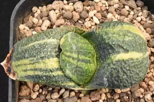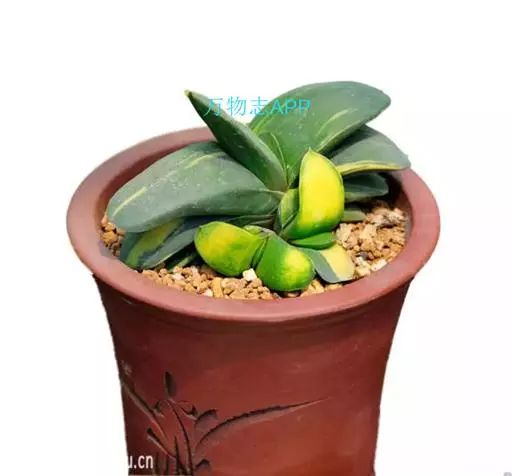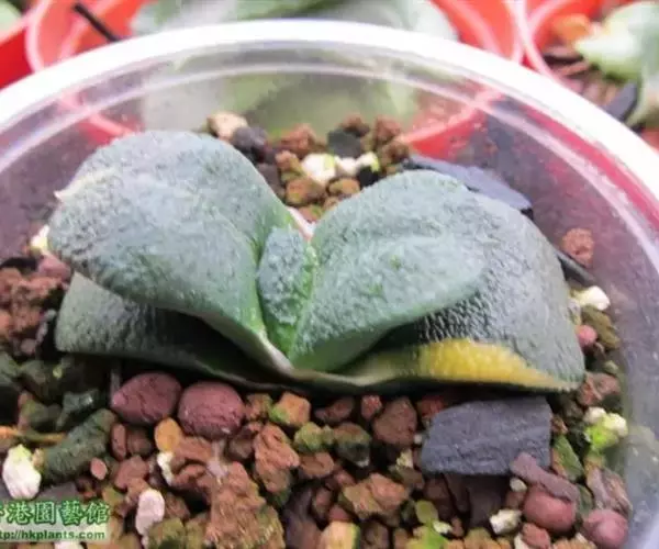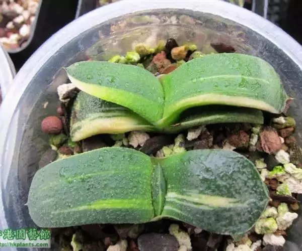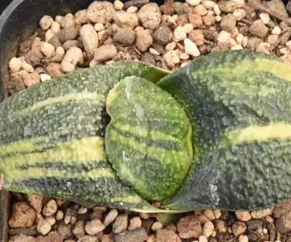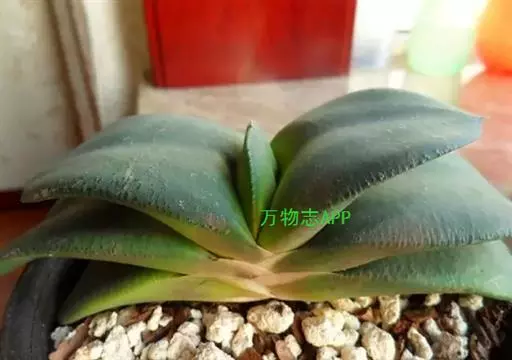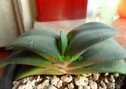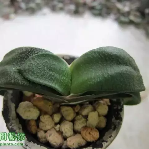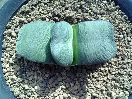 幼株叶两列叠生,肉质厚,长3~5厘米、宽3厘米。叶舌状,先端有尖,表皮有白色小疣,叶缘和叶尖都有小疣。成年株叶排列成莲座状,直径6~10厘米,单叶长5~6厘米、宽3~4厘米、厚1厘米,叶尖背面有明显的龙骨突,部分叶表面小疣脱落。