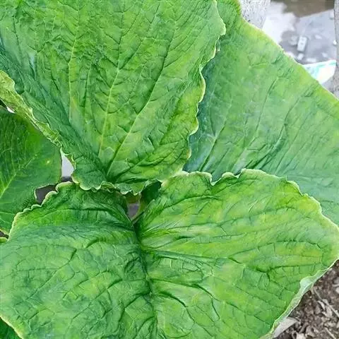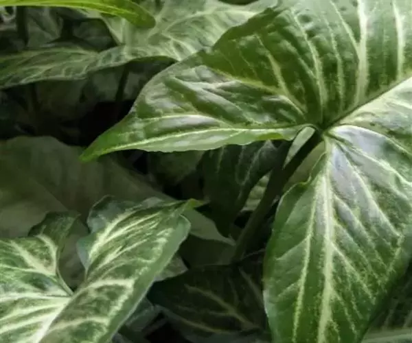 叶片呈两型性,幼叶为单叶,箭形或戟形;老叶成5-9裂的掌状叶,中间一片叶大型, 叶基裂片两侧常着生小型耳状叶片。初生叶色淡,老叶呈深绿色,且叶质加厚。合果芋的叶的颜色在地上的时候是白色的,当它攀附到树上的时候,它的颜色就会变深变绿。叶的形状也会随着改变,在地上的时候,叶的形状是盾形的,随着植株攀附到树上,叶的分裂也会随着增加,它可以分裂到七八片之多,叶的颜色变深变绿,在树干上的它新发出来的小叶颜色也没有发白,小叶分裂的很多,而且在同一植株上,树干基部的合果芋的叶片不分裂,在树干中部的叶片才开始分裂。这种同一植株上有不同叶形的现象叫做异形叶性。异形叶性的发生,有两种情况:一种是叶因枝的老幼不同而叶形各异,另一种是由于外界环境的影响而引起异形叶性。