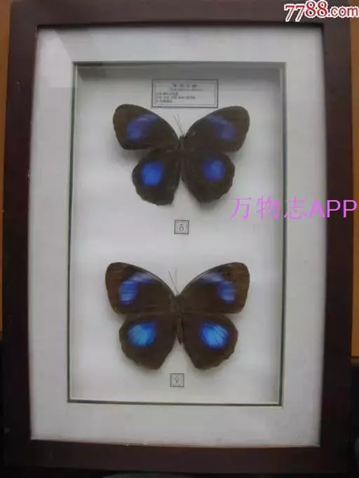 紫斑环蝶翅展80-90mm,翅圆形,外缘弧状,底色深褐,前后翅中域有大淡蓝白色斑;翅反面黑褐色,外缘淡褐色,前、后翅有3条暗色带,后翅rs、cu1.室各有1个眼斑。 其翅膀表面分布着两种类型的鳞片,呈覆瓦状排列,均布于整个翅膀表面。其中一类鳞片对蓝色结构色的产生起着关键性作用。