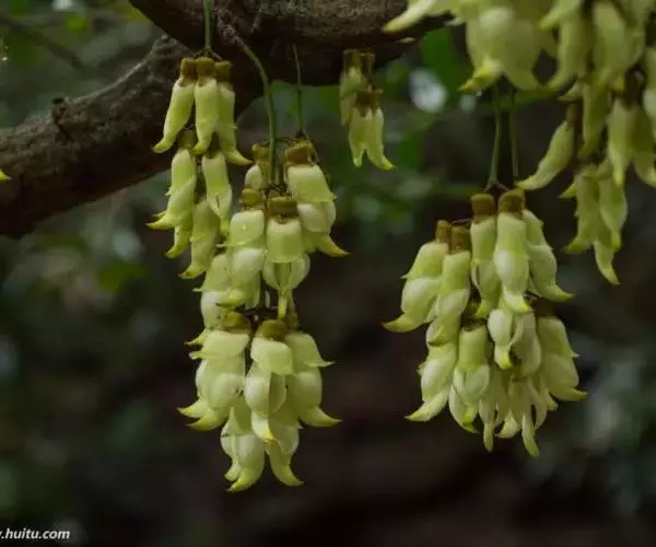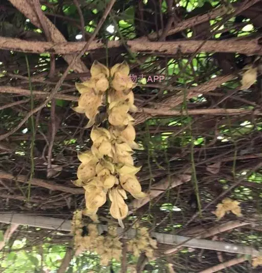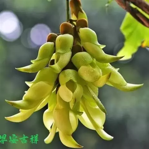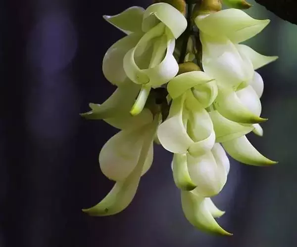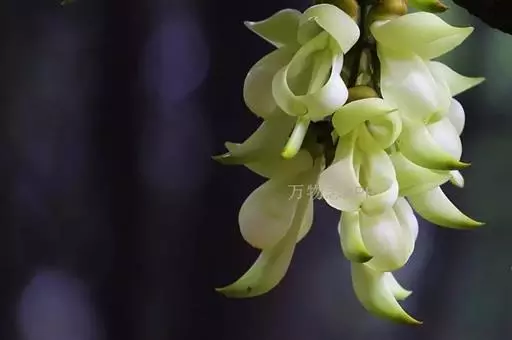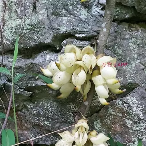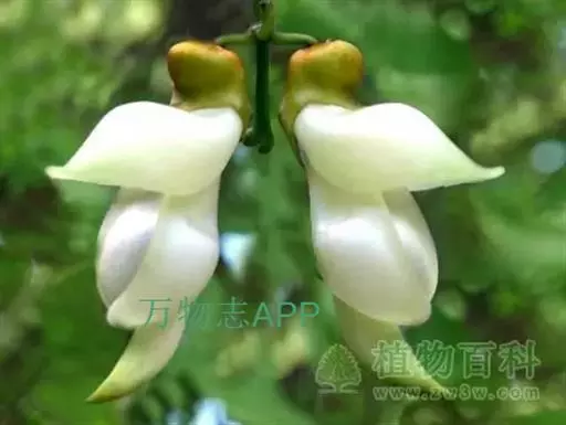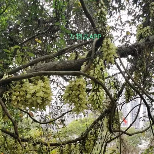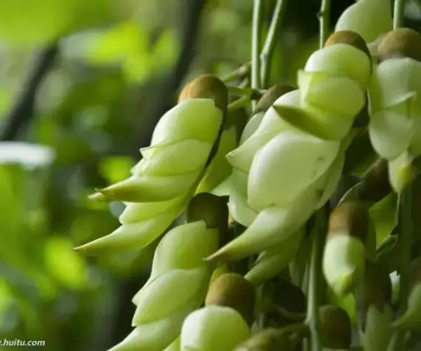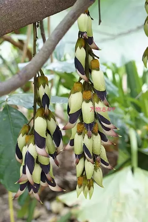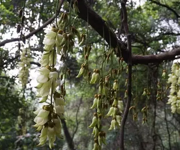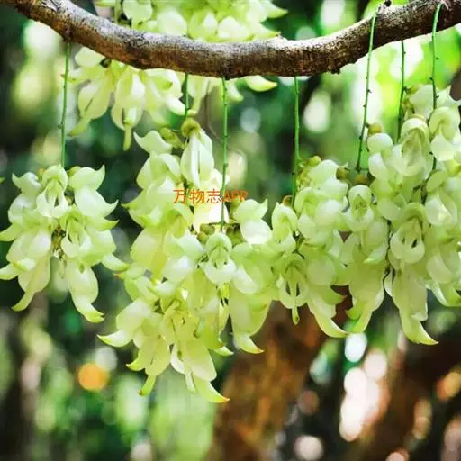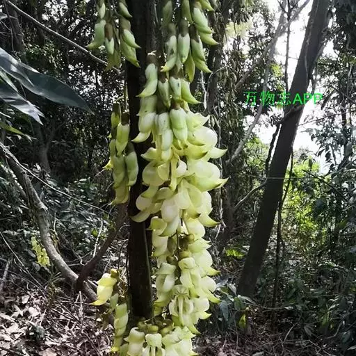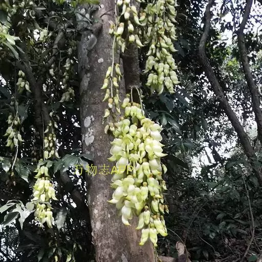 白花油麻藤(Mucuna birdwoodiana Tutcher),蝶形花科黎豆属,又名禾雀花、常绿木质大型藤本。该种生长迅速,蔓茎粗壮,叶繁荫浓,茎长可达30米以上,其生命力顽强,能盘树缠绕,越冠飞枝,攀石穿缝。其花序悬挂于悠长盘曲的老茎上,吊挂成串,每串二、三十朵,串串下垂。酷似无数白中带翠,如玉温润的小鸟栖息在枝头。