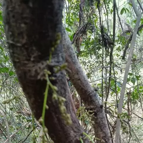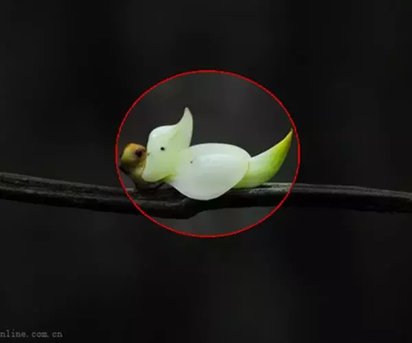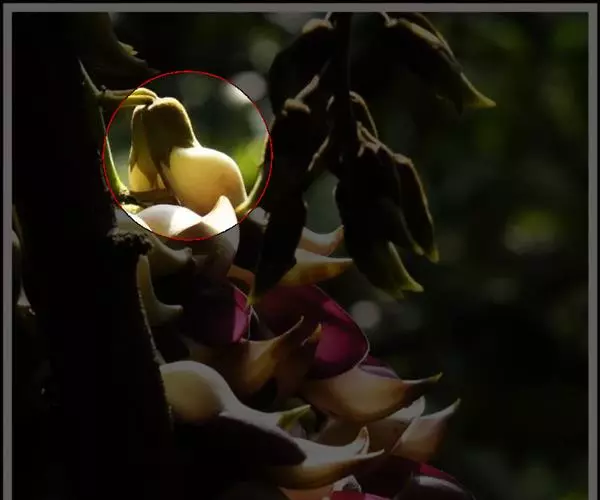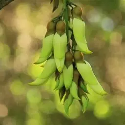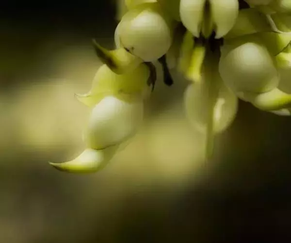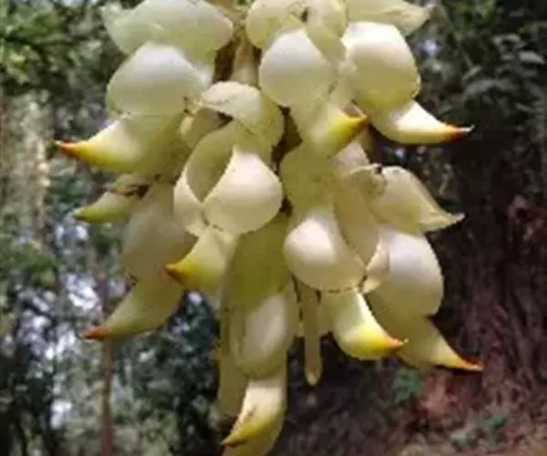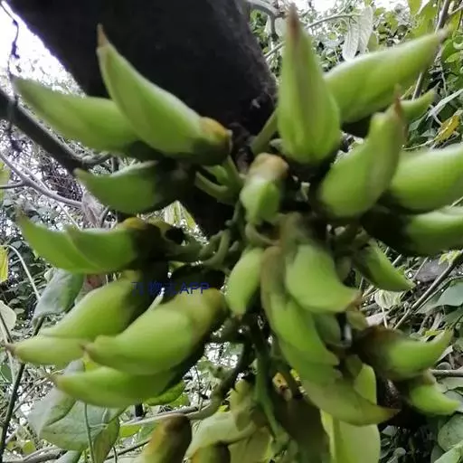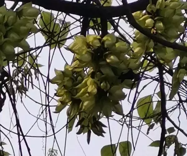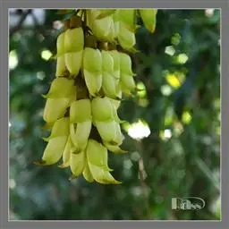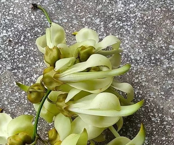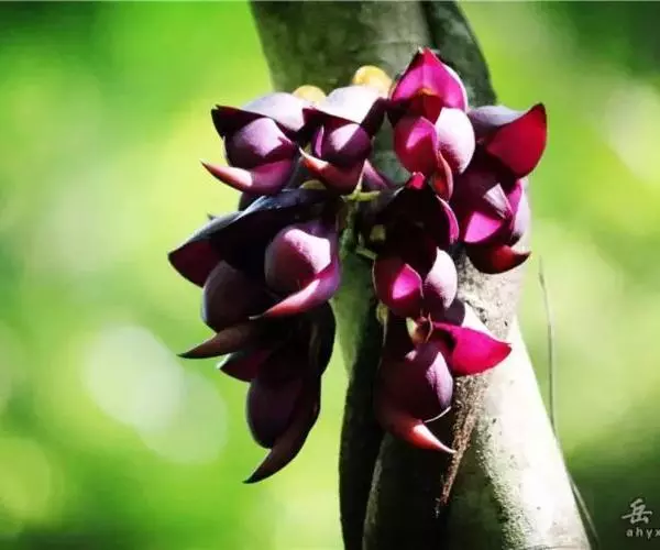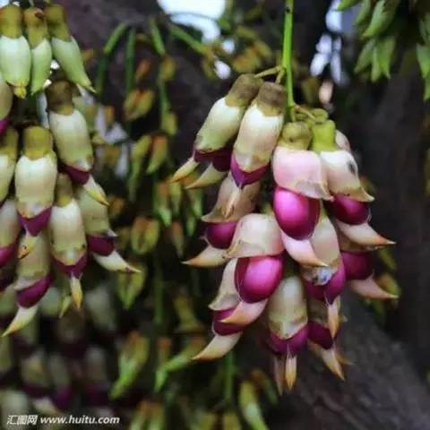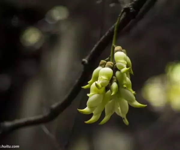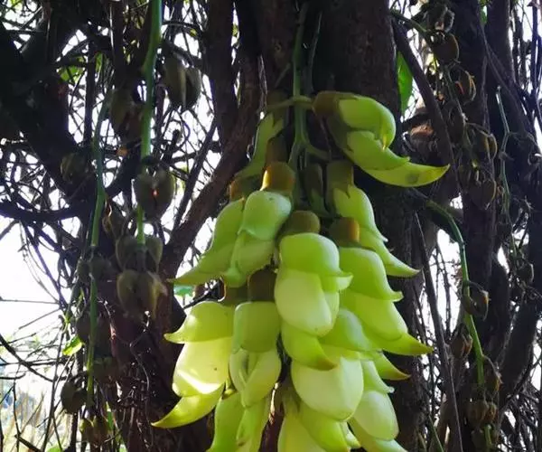 白花油麻藤(Mucuna birdwoodiana Tutcher),蝶形花科黎豆属,又名禾雀花、常绿木质大型藤本。该种生长迅速,蔓茎粗壮,叶繁荫浓,茎长可达30米以上,其生命力顽强,能盘树缠绕,越冠飞枝,攀石穿缝。其花序悬挂于悠长盘曲的老茎上,吊挂成串,每串二、三十朵,串串下垂。酷似无数白中带翠,如玉温润的小鸟栖息在枝头。