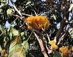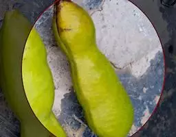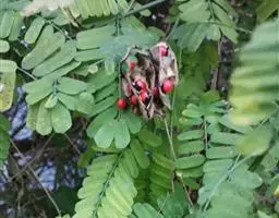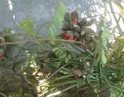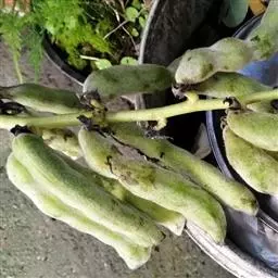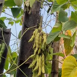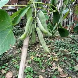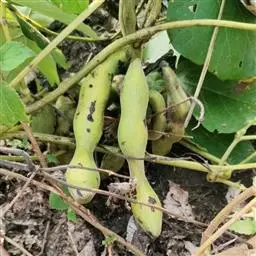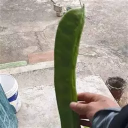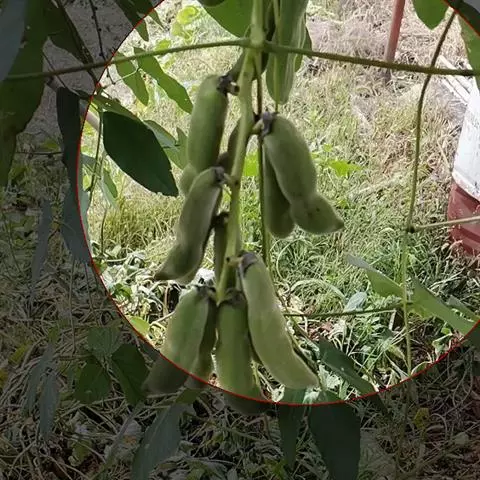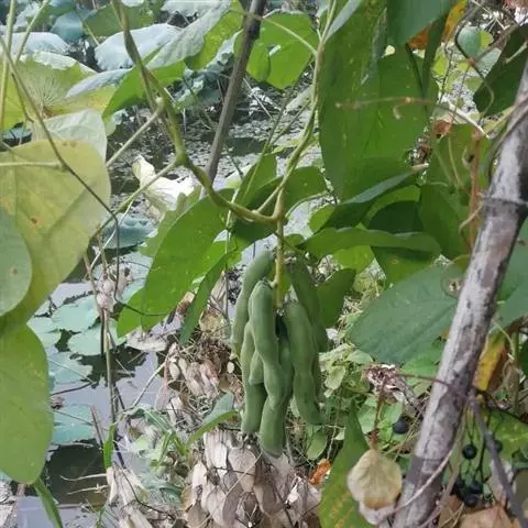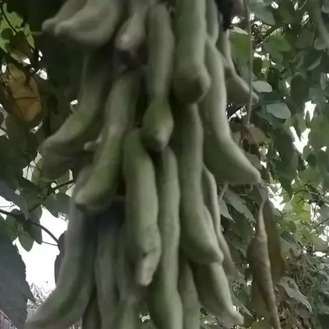 果木质,带形,长30-45厘米,宽3.5-4.5厘米,厚1-1.5厘米,近念珠状,密被红褐色短绒毛,幼果常被红褐色脱落的刚毛,沿背、腹缝线各具宽3-5毫米的木质狭翅,有纵沟,内部在种子之间有木质隔膜,厚达4毫米;种子5-13颗,深紫黑色,近肾形,长约2.8厘米,宽约2厘米,厚8-10毫米,常有光泽,种脐为种子周长的1/2-3/4。花期4-6月,果期6-11月。