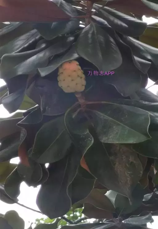 落叶常绿乔木,在原产地高达30米;树皮淡褐色或灰色,薄鳞片状开裂;小枝粗壮,具横隔的髓心;小枝、芽、叶下面,叶柄、均密被褐色或灰褐色短绒毛(幼树的叶下面无毛)。叶厚革质,椭圆形,长圆状椭圆形或倒卵状椭圆形,长10-20厘米,宽4-7(10)厘米,先端钝或短钝尖,基部楔形,叶面深绿色,有光泽;侧脉每边8-10条;叶柄长1.5-4厘米,无托叶痕,具深沟。花白色,有芳香,直径15-20厘米;花被片9-12,厚肉质,倒卵形,长6-10厘米,宽5-7厘米;雄蕊长约2厘米,花丝扁平,紫色,花药内向,药隔伸出成短尖;雌蕊群椭圆体形,密被长绒毛;心皮卵形,长1-1.5厘米,花柱呈卷曲状。聚合果圆柱状长圆形或卵圆形,长7-10厘米,径4-5厘米,密被褐色或淡灰黄色绒毛;蓇葖背裂,背面圆,顶端外侧具长喙;种子近卵圆形或卵形,长约14毫米,径约6毫米,外种皮红色,除去外种皮的种子,顶端延长成短颈。花期5-6月,果期9-10月。