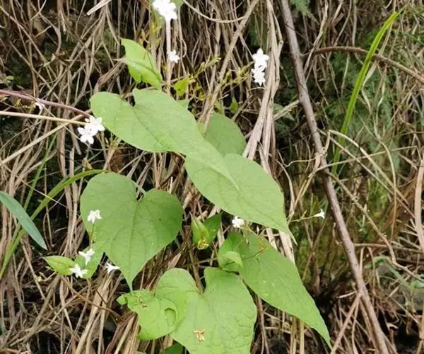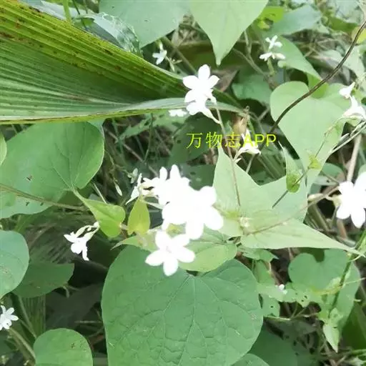 多年生攀缘灌木。长达10m。茎缠绕,圆柱形,幼时多少被黄色硬毛或近光滑,后来具小瘤或无毛。单叶互生;叶柄长5-11cm,被疏毛至无毛;叶片卵形,长6-11cm,宽5-10cm,先端渐尖或尾状,具钝或锐尖的尖头,基部深心形,两面疏被紧贴的柔毛;掌状脉基生,7-9条。圆锥花序腋生;苞片叶状,心形,抱茎;小苞片钻形;花柄长3-6mm;萼片5,线状披针形,通常被柔毛,结果时全部增大,呈长圆状匙形;花冠漏斗形,白色,管部带黄色,5裂至中部;雄蕊5,内藏,花丝短于花药;子房无毛,花柱1,柱头棒状,2裂。蒴果卵形,长7-8mm,具小短尖头,无毛。种子1,卵形,长约6mm,暗褐色或黑色,平滑。花期9月。