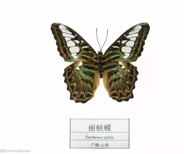 云南丽蛱蝶(学名:Parthenos sylvia gambrisius):是丽蛱蝶的云南亚种。此种为云南省省蝶。在中国仅有云南出产,且数量较少。翅面橄榄绿或带淡蓝色,前翅有不同形状的大白斑,其周围有黑色缘,组成长三角形。两翅基本有黑色条纹于橄榄绿色相间。幼虫由绿色到黄褐色,有一条深褐色背线,有黄白色节线。每节有深紫色枝刺。外缘黑白相间,构成极为美丽的图案,双翅半垂半拢时尤为美观。