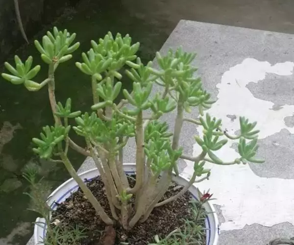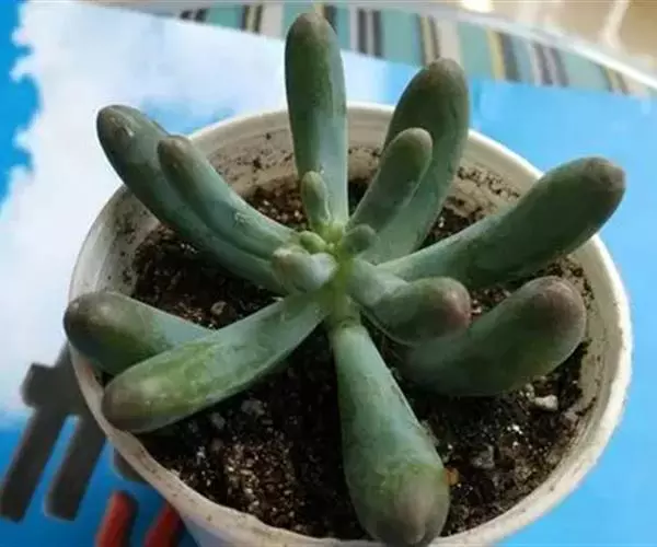 多年生肉质植物,植株呈小灌木状,高20-30厘米,多分枝。叶片松散地簇生于分枝顶部,叶肉质,圆柱形,表面平整光滑,稍向上内弯,顶端圆钝较基部稍细,叶长3-4厘米,粗约0.6厘米,叶色灰绿或浅蓝绿色。在阳光充足的条件下,叶先端呈橙色或橙黄色,在冷凉季节或温差较大、阳光充足环境下尤为明显。老株或植株生长不良时,茎下部叶片萎缩或脱落,并长出气生根。春季开黄色小花。 八千代