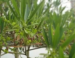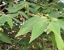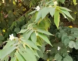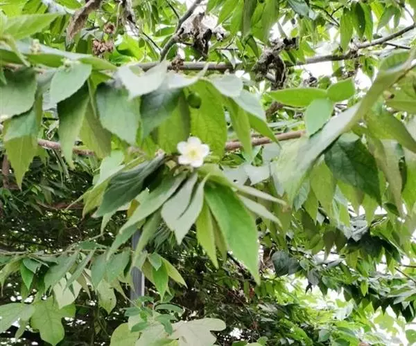 枝叶:枝叶婆娑茂密, 茎皮纤维发达,枝条较柔软,尾部略下垂,叶腋可生枝条,形成“假二回” 或“假三回”羽状复叶效果。叶片纸质,长卵形或长椭圆状卵形,基部偏斜,翠绿清秀。 文定果(花)