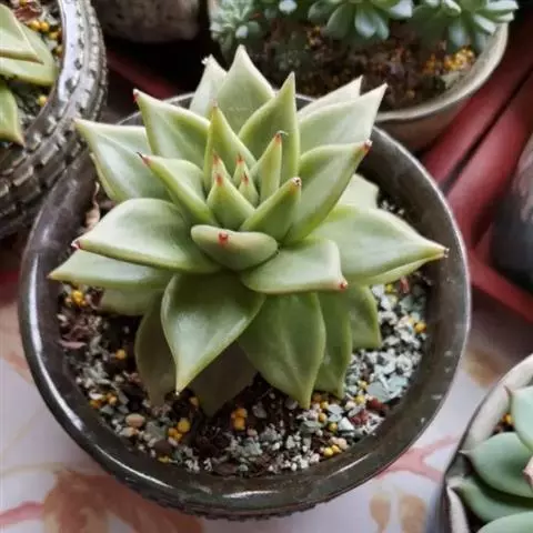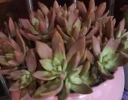 大和锦是景天科拟石莲花属的多肉植物。肉质叶排成紧密的莲座状,广卵形至散三角卵形,背面突起呈龙骨状,…