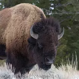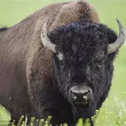 美洲野牛,学名:Bison bison (Linnaeus, 1758);英文名:American bison),牛科美洲野牛属的一种动物。又名美洲水牛或犎牛,是北美洲体型最大的哺乳动物和世界上最大野牛之一。也是一种比较凶悍的动物,体重可达1000千克,头上长有一对向上弯曲锋利的双角,即使面对最富攻击性的捕食动物,也毫不退缩。它们长有深暗的栗子褐色毛发,有如同小丘一样的大肩膀。在种群之内,各自的公牛形成一个集体并保卫族群中的母牛,在6-9月期间是美洲野牛的繁殖期。每头母牛每年能诞生一头小牛。