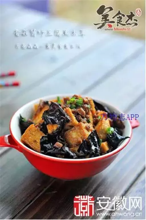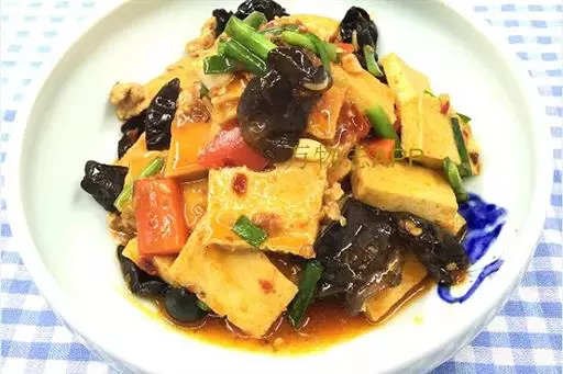 豆腐500克,木耳50克,葱末、姜末、火腿、盐、花生油、水淀粉、鲜汤各适量。