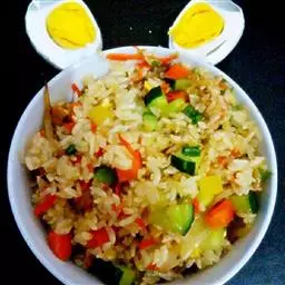 1、将豆腐上锅蒸熟,取出切丁;木耳用温水泡,发后洗净切丁,火腿切丁;