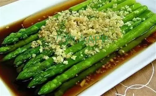 原料:芦笋、姜、精盐、味精、香油。 做法: 将芦笋洗净,去掉老根,用开水焯熟;姜切末,与其它料一同拌匀,浇在摆好的芦笋上即可食用,此菜具有色泽碧绿,鲜咸爽脆的特点。注意焯芦笋的时间不宜过长,焯过应马上用冷水冲泡,否则不脆。