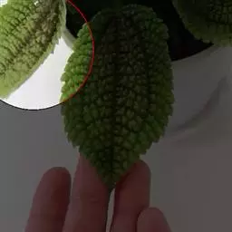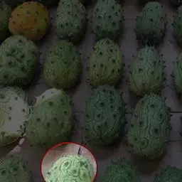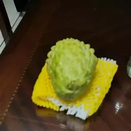 毛叶番荔枝的表皮颜色是绿褐色的,它的形状很不规则,好像有人已经-在上面按了指印。果实隐约呈圆形,果皮有三种类型:凹痕状、结瘤状、或前两种形状的混合;内部的果肉芳香浓郁,白色多汁,肉质像奶油冻。据说水果吃起来像香蕉、百香果、番木瓜和菠萝四种水果的混合口味。马克.吐温在1866年说过“毛叶番荔枝是人类已知最可口的水果”。