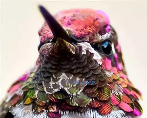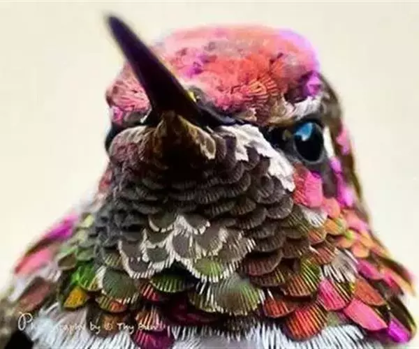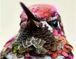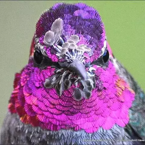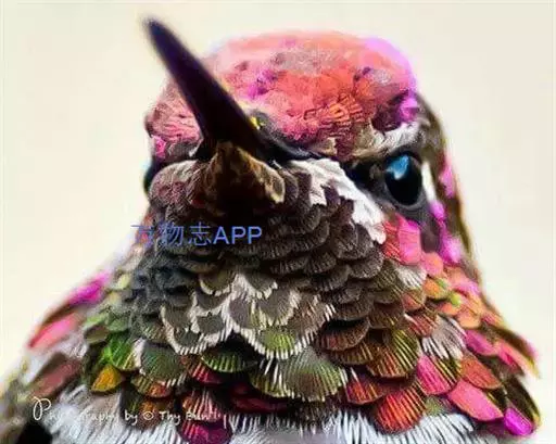成年雄性头部羽毛上的结构色会随光线角度而变化,所以看着会各种变色。它是唯一头部有粉红色冠冕的北美蜂鸟。