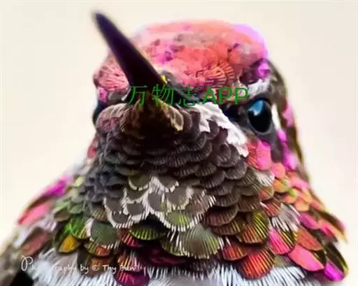 安氏蜂鸟,长度10-11厘米,两性异形。分布于北美洲西海岸,以花蜜为主食,也会捕食飞行的昆虫。俗称“颜色隐秘鸟”。