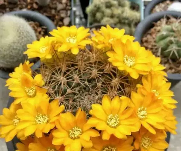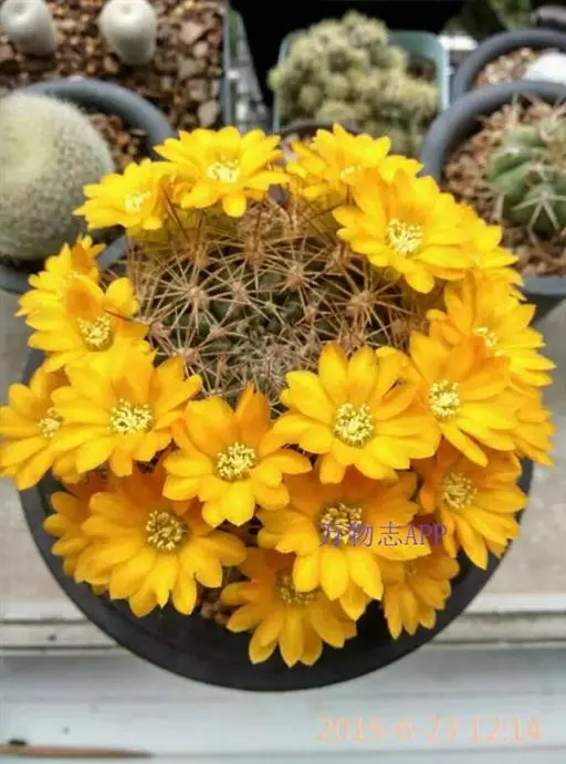 花笠丸 外观变化多样,通常为单株球状至短柱状。束状须根,无块根,硬刺,基部为白色,至末端逐渐成为黑色,中刺2~8,边刺数目5~24支不定。花瓣黄色,与其他Rebutia属品种比较起来,此品的开花位置比较靠近生长点些,花季可由春季开至秋季。