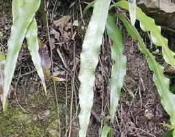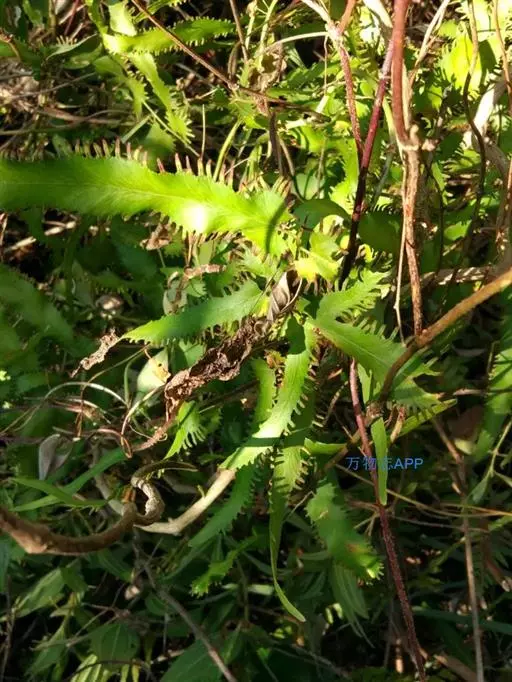 植株蔓攀,高达5-7米。叶轴纤细如铜丝,二回羽状;羽片多数,相距约7-9厘米,羽片对生于叶轴的距上,距长2-4毫米,顶端密生红棕色毛。不育羽片生于叶轴下部,长圆形,长7-8厘米,宽4-7厘米,柄长1-1.2厘米,奇数羽状,或顶生小羽片有时两叉,小羽片4对,互生,有2-4毫米长的小柄,柄端有关节,各片相距约8毫米,卵状三角形、阔披针形或长长圆形,先端钝,基部较阔,心脏形,近平截或圆形。边缘有矮钝齿,或锯齿不甚明显。叶脉清晰,三出,小脉2-3回二叉分歧,斜向上,直达锯齿。叶薄草质,干后暗黄绿色,两面光滑。能育羽片长圆形,长8-10厘米,宽4-6厘米,通常奇数羽状,小羽片的柄长2-4毫米,柄端有关节,9-11片,互生,各片相距7-10毫米,三角形或卵状三角形,钝头,长1.5-3厘米,宽1.5-2厘米。孢子囊穗排列于叶缘,到达先端,5-8对,线形,一般长3-5毫米,最长的达8-10毫米,黄褐色,光滑。