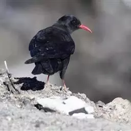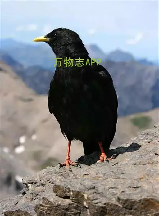 红嘴山鸦(学名:Pyrrhocorax pyrrhocorax): 大型鸦类,体长36-48厘米。嘴、脚红色,通体黑色具蓝色金属光泽。雌雄羽色相似,全身羽毛纯黑色具蓝色金属光泽。两翅和尾纯黑色具蓝绿色金属光泽。虹膜褐色或暗褐色,嘴和脚朱红色。相似种黄嘴山鸦嘴为黄色而不为红色,野外不难区别。