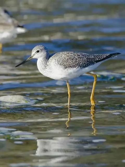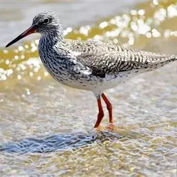红脚鹬:体长28厘米,上体褐灰,下体白色,胸具褐色纵纹。飞行时腰部白色明显,次级飞羽具明显白色外缘。…