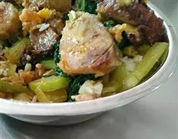 多宝菠菜的主料是菠菜,辅料玉米粒、火腿、胡萝卜、红腰豆等。