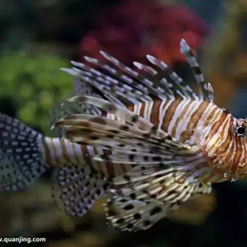 斑鳍蓑鲉是鲉科,蓑鲉属硬骨鱼。体长25-40厘米,体表黄色,布有红色至棕色条纹。背部有毒棘,胸鳍羽…