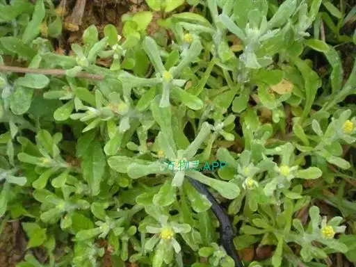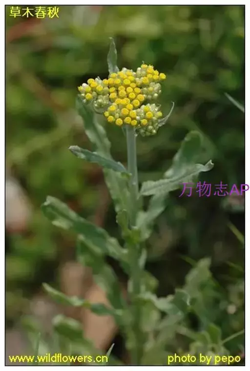 一年生草本。茎直立或基部发出的枝下部斜升,高10-40厘米或更高,基部径约3毫米,上部不分枝,有沟纹,被白色厚棉毛,节间长8-20毫米,上部节间罕有达5厘米。叶无柄,匙状倒披针形或倒卵状匙形互生,长5-7厘米,宽11-14毫米,上部叶长15-20毫米,宽2-5毫米,基部渐狭,稍下延,顶端圆,具刺尖头,两面被白色棉毛,上面常较薄,叶脉1条,在下面不明显。头状花序较多或较少数,径2-3毫米,近无柄,在枝顶密集成伞房花序,花黄色至淡黄色;总苞钟形,径约2-3毫米;总苞片2-3层,金黄色或柠檬黄色,膜质,有光泽,外层倒卵形或匙状倒卵形,背面基部被棉毛,顶端圆,基部渐狭,长约2毫米,内层长匙形,背面通常无毛,顶端钝,长2.5-3毫米;花托中央稍凹入,无毛。雌花多数,花冠细管状,长约2毫米,花冠顶端扩大,3齿裂,裂片无毛。两性花较少,管状,长约3毫米,向上渐扩大,檐部5浅裂,裂片三角状渐尖,无毛。瘦果倒卵形或倒卵状圆柱形,长约0.5毫米,有乳头状突起。冠毛粗糙,污白色,易脱落,长约1.5毫米,基部联合成2束。花期1-4月,8-11月。