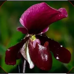 花序从茎的基部发出,常1-2个,斜立,长4-8.5厘米,不分枝,花序轴疏生2-5朵花;花序柄暗紫色,粗约2毫米,被1-2枚膜质鞘;花苞片膜质,卵状三角形,长4-5毫米,先端锐尖;花梗连同子房长3-3.8厘米;花开放,萼片和花瓣白色带淡粉红色的中肋或全体淡粉红色;中萼片长圆状椭圆形,长1.5-2厘米,宽6-7毫米,先端钝,具5条脉;侧萼片与中萼片相似而等大,但近唇瓣一侧的中部以下边缘下弯,基部贴生在蕊柱足上;花瓣匙形或椭圆状倒卵形,长1.4-1.5厘米,宽6-10毫米,先端圆形,基部楔形收狭;唇瓣基部具长2-3毫米的爪,3裂;侧裂片上半部紫色,下半部黄色,直立,狭长,长约6毫米,中部缢缩,上部扩大而先端斜截,在基部(两侧裂片之间)具1个中央对开的肉脊,其中间具穴并且向外(背面)隆起呈乳头状,内面中央的凸缘(脊突)黄色,其先端斜截并且具2至数个小缺刻;中裂片肉质,深紫色,摊平后呈宽倒卵形或倒卵状椭圆形,长8-13毫米,上部宽6-9毫米,先端钝并且稍2裂,基部具1枚紫色而先端深裂为2叉状的附属物,边缘白色、下弯而形成倒舟状,上面中央具1条纵向脊突,脊突在近唇瓣先端处强烈增厚而隆起;蕊柱淡紫色,长约6毫米,具长约3毫米的蕊柱足;药帽白色,前端稍伸长呈卵状三角形;花粉团2个,近球形,每个劈裂为不等大的2爿。