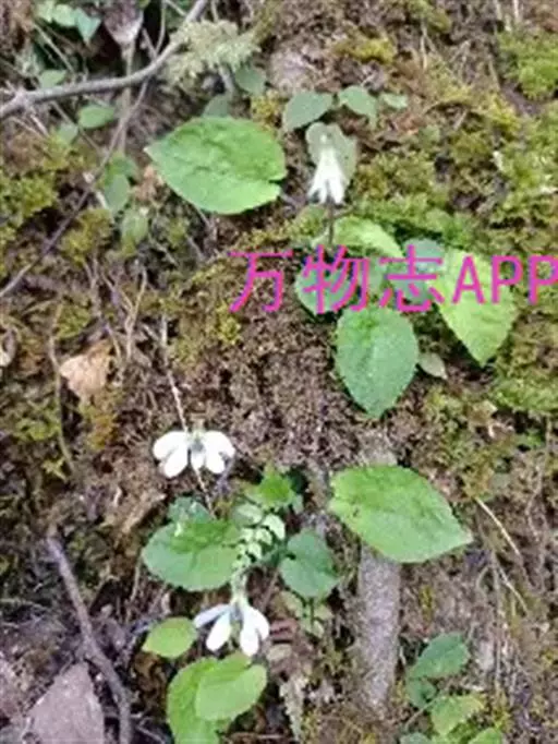 花白色;花梗通常高出于叶丛,密被开展的白色柔毛,中部以上有2枚对生的线形小苞片;萼片狭卵状披针形或披针形,长7-9毫米,先端渐尖,基部附属物短,长约2毫米,末端钝,边缘及外面有柔毛,具3脉;花瓣长圆状倒卵形,长1-1.5厘米,先端稍尖,侧方2枚花瓣里面基部稍有须毛,下方1枚花瓣较短连距长约7毫米;距短而粗,呈囊状,长2-2.5毫米,粗约2毫米;下方2枚雄蕊具角状距,稍长于花药,末端尖;子房圆锥状,无毛,花柱棍棒状,基部稍膝曲,向上增粗,顶端略平,两侧有明显的缘边,前方具短喙,喙端具向上开口的柱头孔。