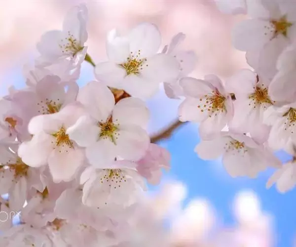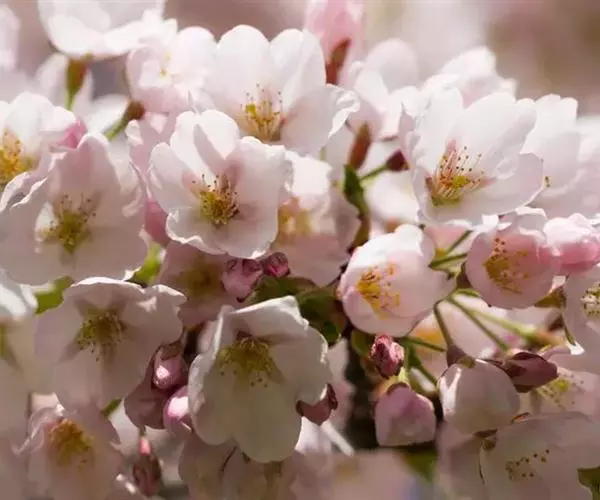 东京樱花(学名:Cerasus yedoensis (Matsum.) Yu et Li):乔木,高4-16米,树皮灰色。小枝淡紫褐色,无毛,嫩枝绿色,被疏柔毛。冬芽卵圆形,无毛。叶片椭圆卵形或倒卵形,上面深绿色,无毛,下面淡绿色,沿脉被稀疏柔毛。花序伞形总状,总梗极短,有花3-4朵,先叶开放,花直径3-3.5厘米;花瓣白色或粉红色,椭圆卵形,先端下凹,全缘二裂;雄蕊约32枚,短于花瓣;花柱基部有疏柔毛。核果近球形,直径0.7-1厘米,黑色,核表面略具棱纹。花期4月,果期5月。2n=16。