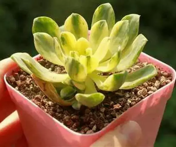 矮小灌木状植株。茎有落叶痕迹,半木质化有气生根, 叶片匙形, 颜色如同名字一样美丽,绿色的叶片中间含有黄色的锦斑。锦斑可能会消失,也可能完全锦斑化(全黄色),决定因素非常多,不可控。这是一种薄叶片的莲花掌属多肉植物,属于“冬种型” 多肉植物。圆锥花序,花黄色。