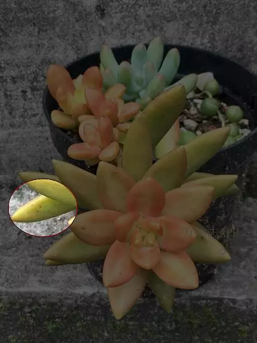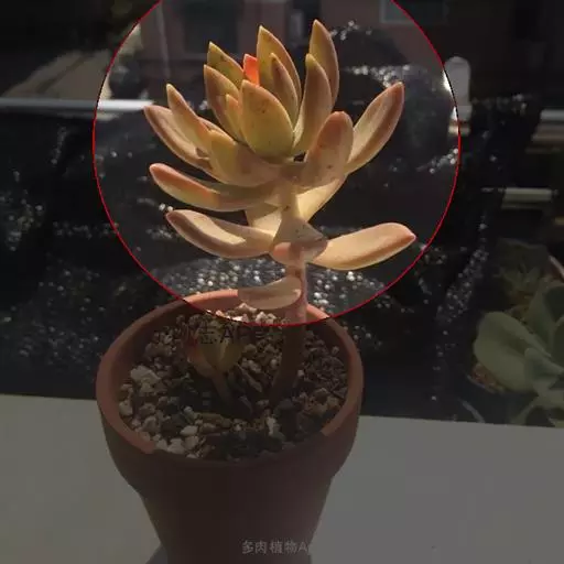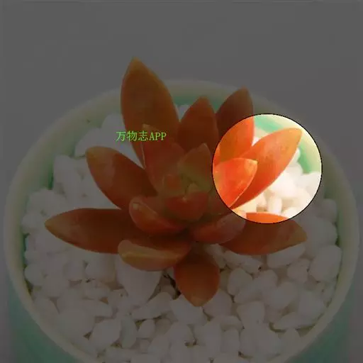 铭月在不同光照环境下会呈现出完全不同的颜色和外形。在阳光充足的环境下叶片边缘或全株呈金黄色至橘黄色,日照强烈环境下全株呈橘黄或橘红色,光照不足环境下叶片呈绿色且叶片间距拉长(徒长)。