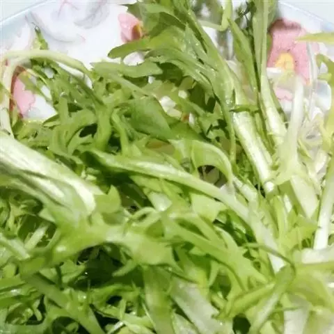 做法:茼蒿洗净切成段,用热水焯熟,捞出挤干水分,最后用精盐、味精、子然粉、五香粉、芥末油、醋、生抽、香油、蒜末拌匀即可。