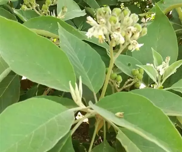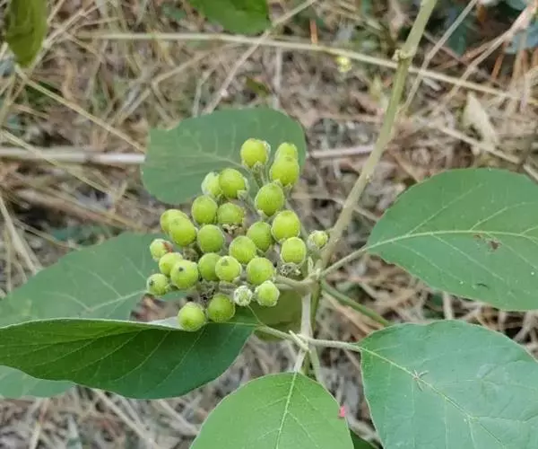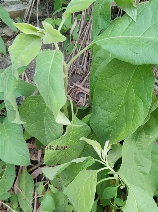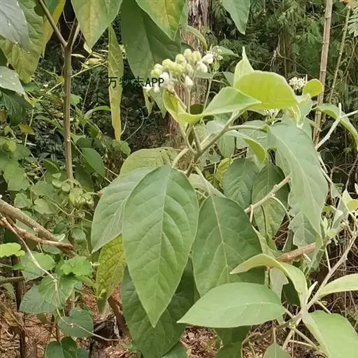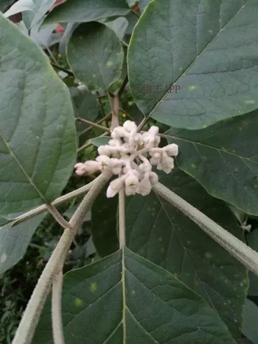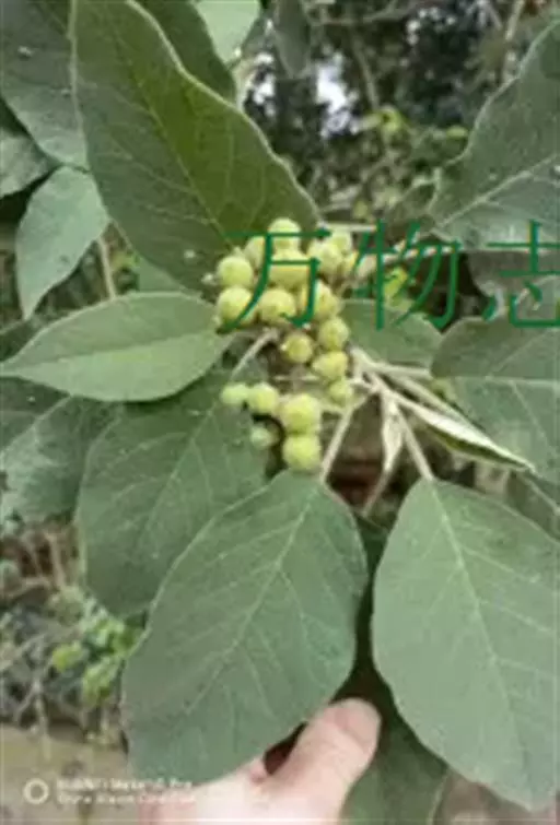 落叶灌木,高l~5m。树皮灰白色。全株均被星状柔毛,有特殊臭气。叶互生,有时对生,有柄;叶片质厚,宽卵形、矩圆状卵形或椭圆状卵形,长10~23cm,宽6~15cm,先端渐尖,基部宽楔形或近圆形,下面密被星状毛。聚伞花序项生或近顶生,总花梗上面有2分枝,每枝有一密集聚伞花序;花萼灰绿色,长约5mm;花冠浅钟状,白色,直径约1.3cm,外面被毛。浆果球形,淡黄绿色,基部有宿萼;种子多数,细小,扁圆形,白色。花期夏、秋季,果期冬季。