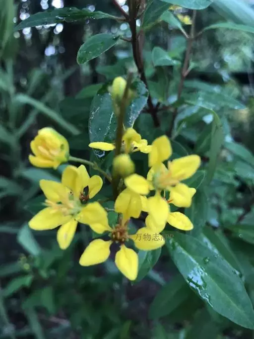 灌木,高1-2米;枝柔弱,淡褐色,嫩枝被褐色柔毛,老枝无毛。叶对生,膜质,长圆形或椭圆状长圆形,长1.5-5厘米,宽8-20毫米,先端纯或圆形,具短尖,基部楔形,有2枚腺体,侧脉每边4-5条,不明显;叶柄长约1厘米;托叶针状,长2-3毫米。总状花序顶生,花序轴被红褐色柔毛;苞片长约3毫米,宿存;花梗长7-13毫米,被红褐色毛,中间具关节,有小苞片2枚;花直径1.5-2厘米,全部无毛;萼片卵圆形,长2-2.5毫米,阔1-1.5毫米;花瓣黄色,长圆状椭圆形,长7-8毫米,中脉明显,花丝基部稍扩大,无毛,黄色,长2.5-4毫米,花药长2-2.5毫米;子房直径2-3毫米,花柱圆柱形,长5-6毫米。蒴果球形,直径约5毫米。花期8-9月,果期10-11月。