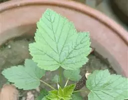 叶圆状肾形至倒卵圆形,长2-5cm,宽几与长相似,基部楔形,稀近圆形或截形,幼时两面均具短柔毛,并常有腺体,成长时柔毛渐脱落,至老时近无毛,掌状3-5深裂,裂片形状不规则,先端稍钝,顶生裂片稍长或与侧生裂片近等长,边缘具粗钝锯齿;叶柄长 (0.5) 1-2cm,被短柔毛。